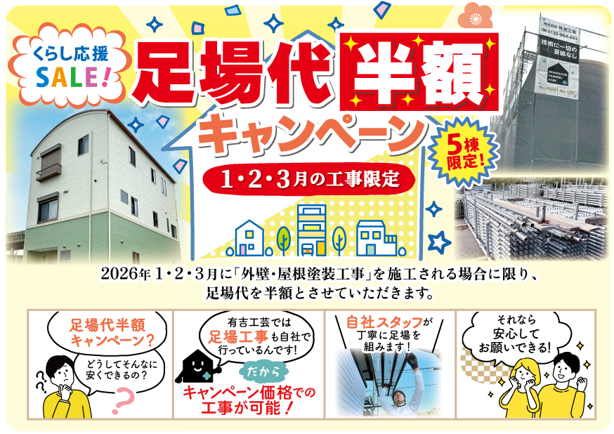 2026年1・2・3月に「外壁・屋根塗装工事」を施工される場合に限り、足場代を半額とさせていただきます。